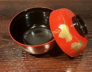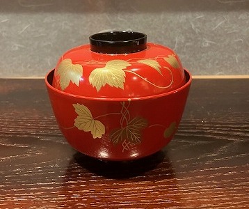 美しい朱塗のお椀に金彩で蔦をかいてあります